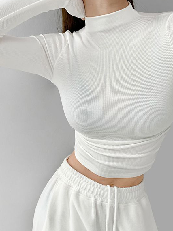 Solid Mock Neck Shirred Slim Long Sleeve Knit