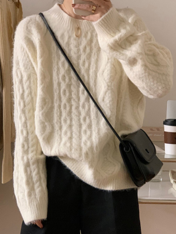 Cable Work Solid Color Round Neck Sweater