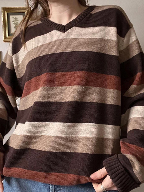 V Neck Loose Contrast Stripes Casual Sweaters