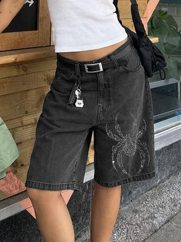 Spider Diamond High Waist Straight Leg Denim Shorts