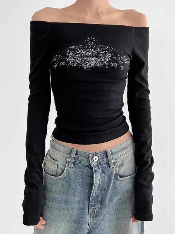 Off Shoulder Floral Print Long Sleeve Tee