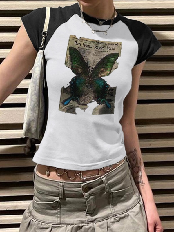Vintage Butterfly Print Raglan Short Sleeve Tee
