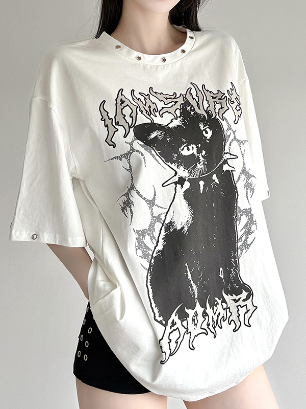 Dark Cat Print Perforated Round Neck Loose T-Shirt