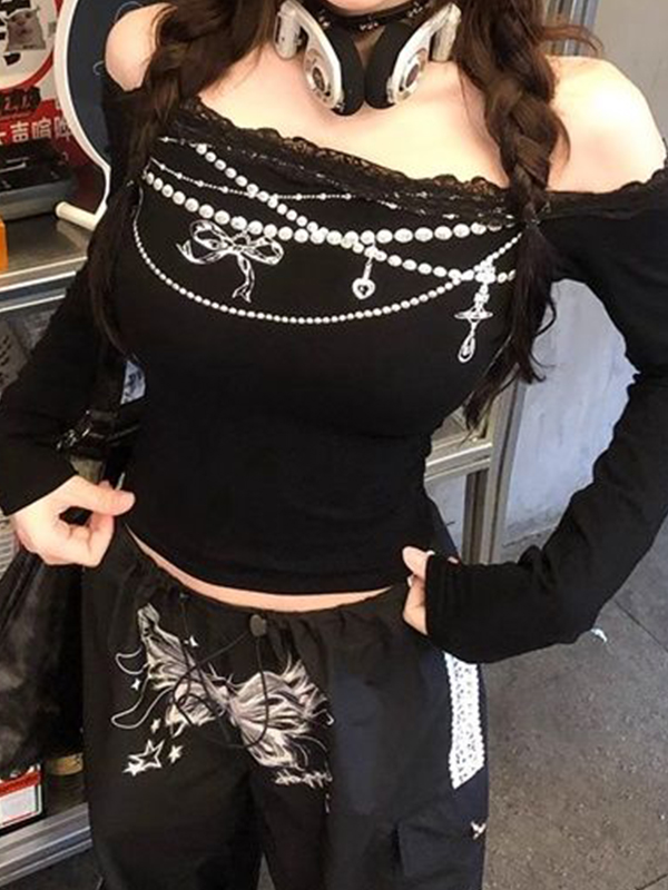One Shoulder Lace Print Long Sleeve Tee