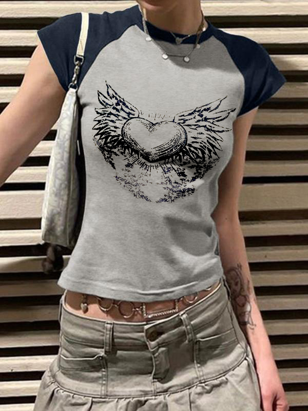 Y2K Wings Print Contrast Raglan Slim Short Sleeve Tee