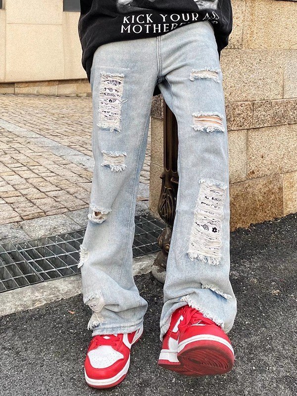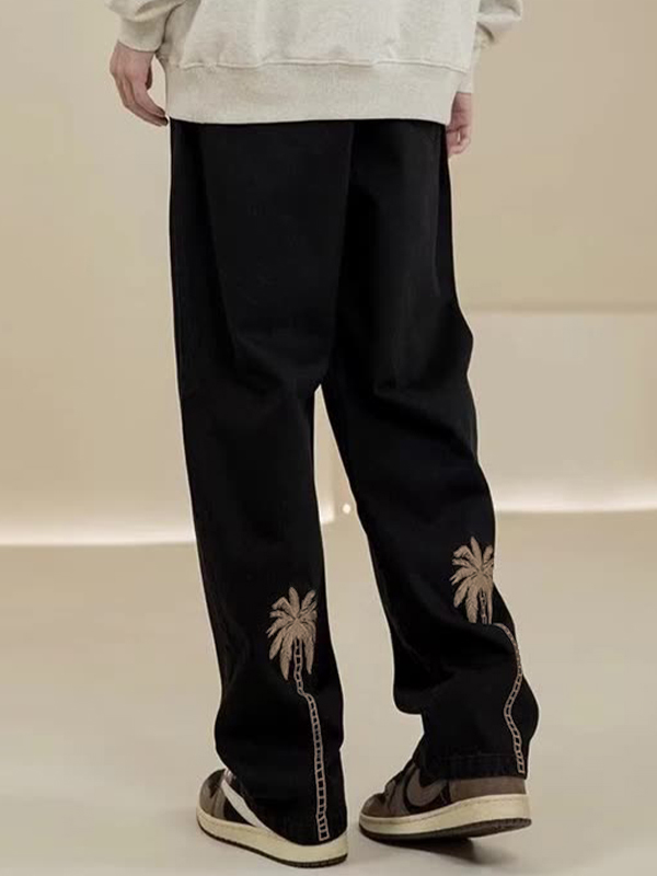 Men’s Coconut Tree Embroidery Print Drawstring Loose Jeans