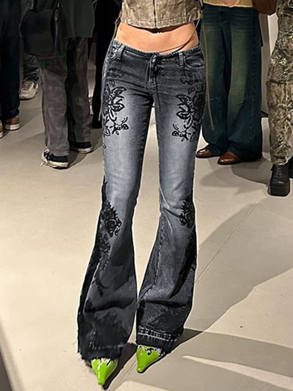 Vintage Plant Print Low Rise Flare Jeans