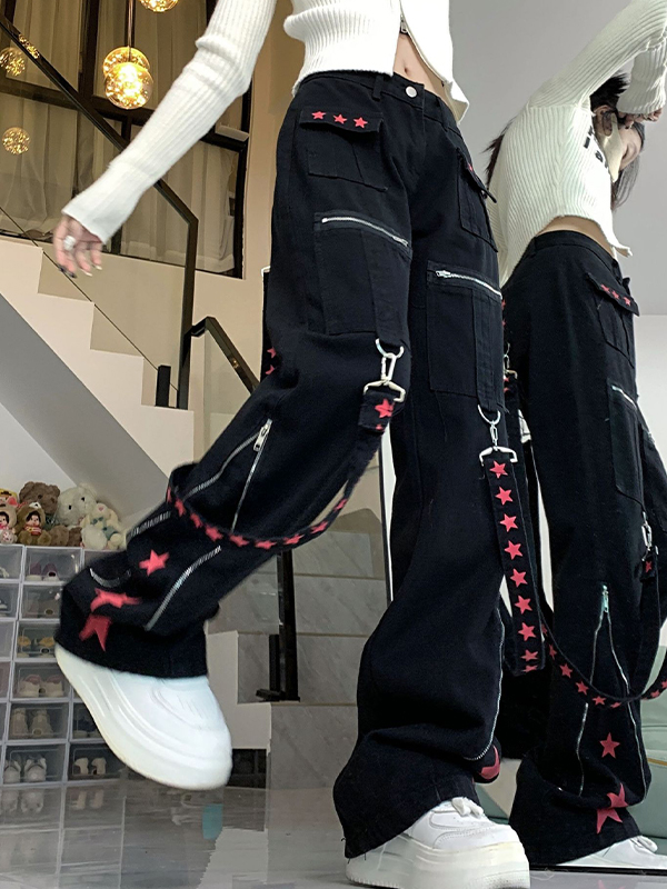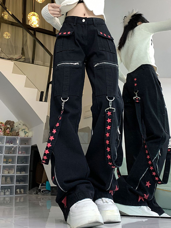 Contrast Color Ribbon Metal Decoration Cargo Jeans quantity