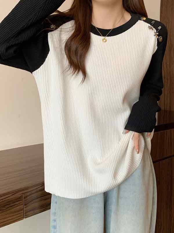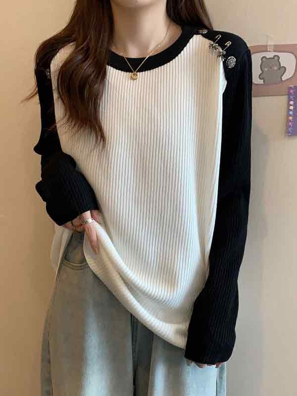 Contrast Color Splice Metal Decor Long Sleeve Knit
