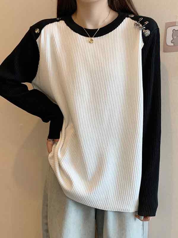 / Contrast Color Splice Metal Decor Long Sleeve Knit