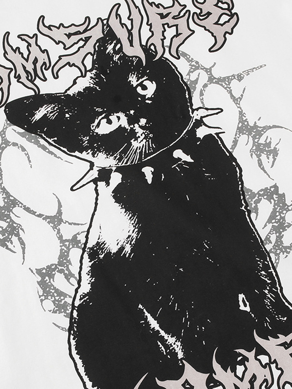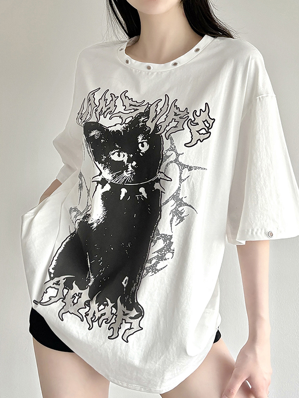 / Dark Cat Print Perforated Round Neck Loose T-Shirt
