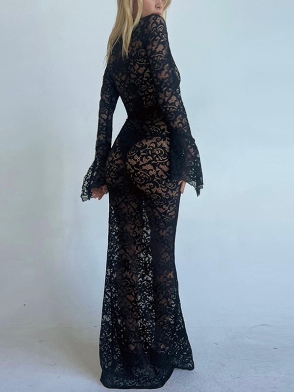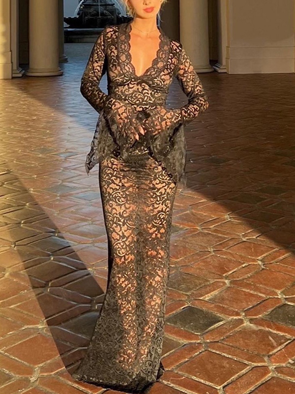 Deep V Lace Pattern See-Through Slim Fit Maxi Dress