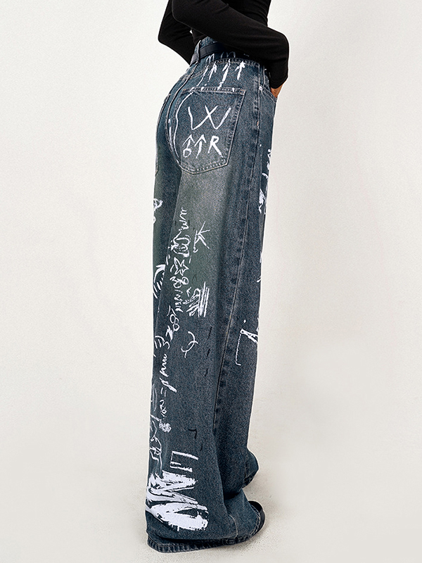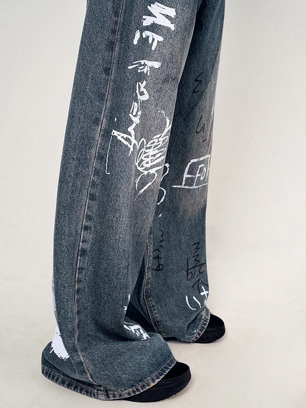 / Distressed Random Graffiti Print Boyfriend Jeans