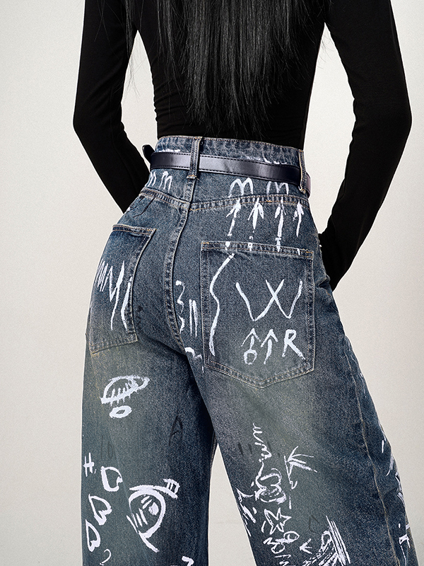 Distressed Random Graffiti Print Boyfriend Jeans quantity