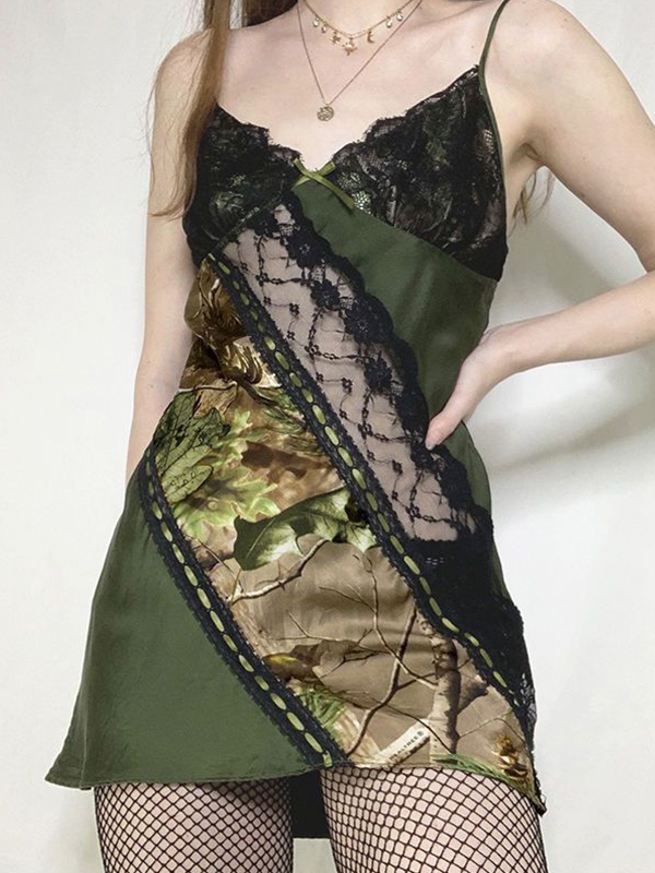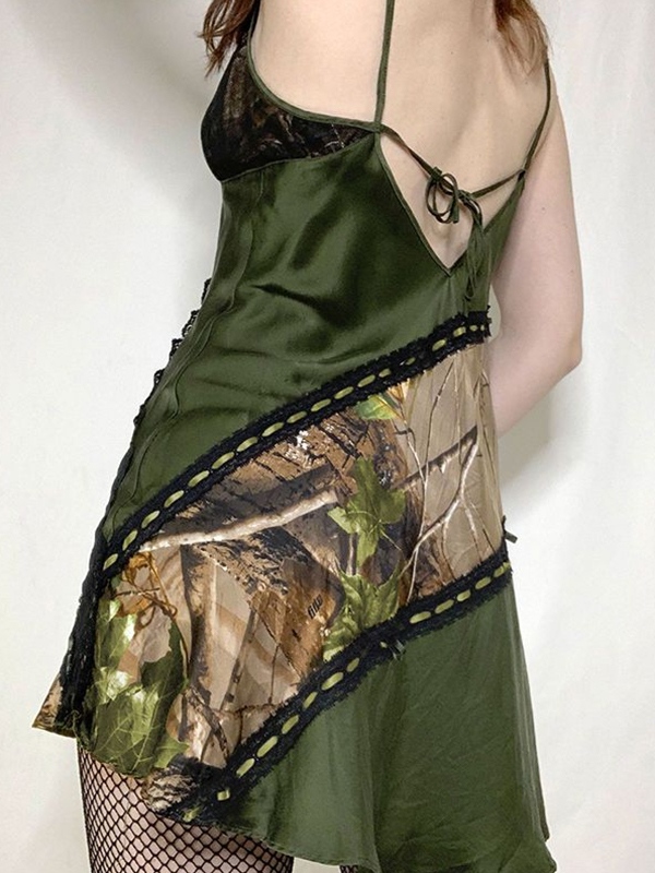 Irregular Print Lace Splice Tie Back Mini Dress