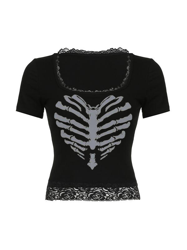 / Lace Patchwork Skull Print Black Short Sleeve Tees
