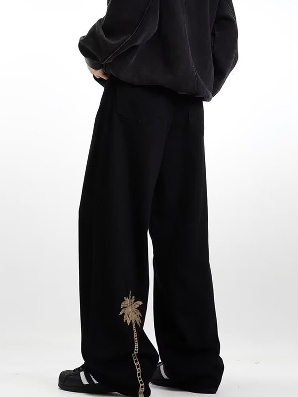 Men’s Coconut Tree Embroidery Print Drawstring Loose Jeans