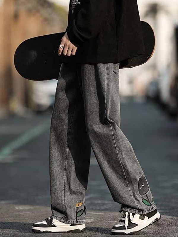 / Men’s Distressed Interesting Flower Embroidery Loose Jeans
