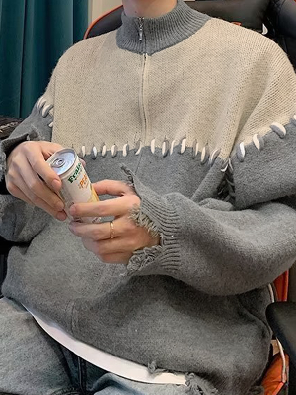/ Men’s Splice Tattered Design Zip Up Knit Jacket