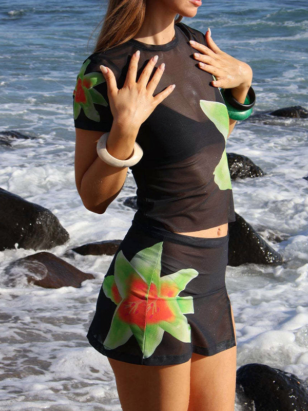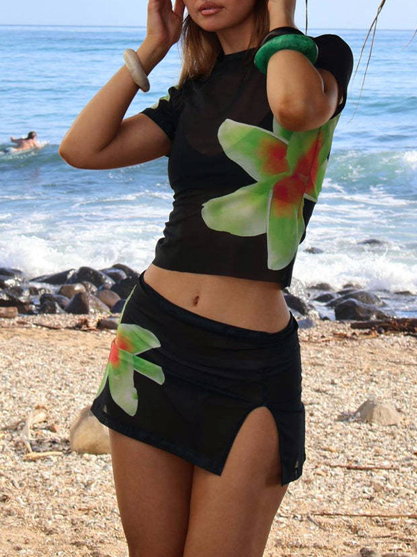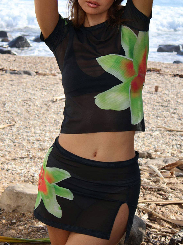 Mesh Flower Print Short Sleeve Tee&Slit Mini Skirt Set