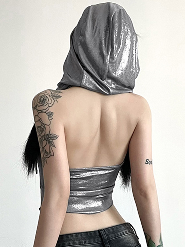 Metallic Eyelet Buckle Hooded Halter Vest