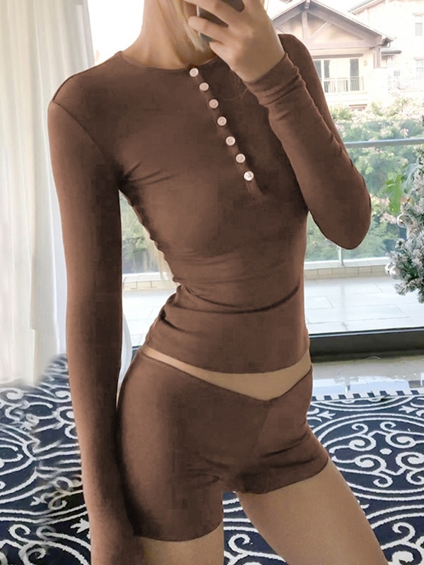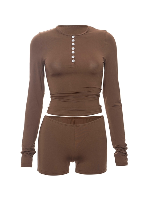 Solid Breasted Long Sleeve Tee&Low Rise Shorts Set