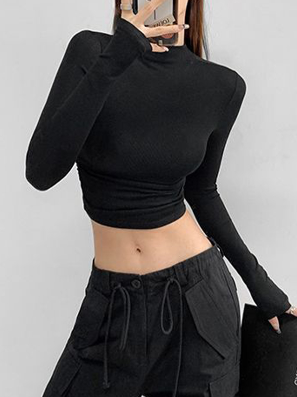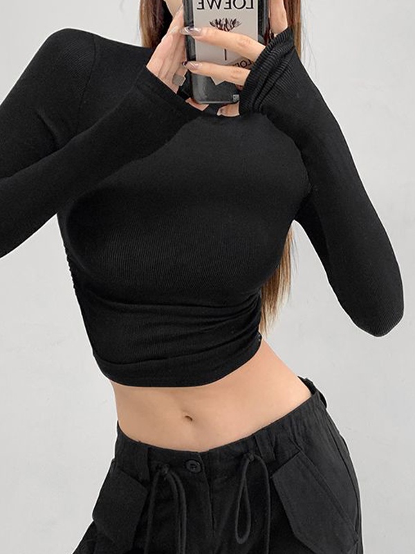 Solid Mock Neck Shirred Slim Long Sleeve Knit