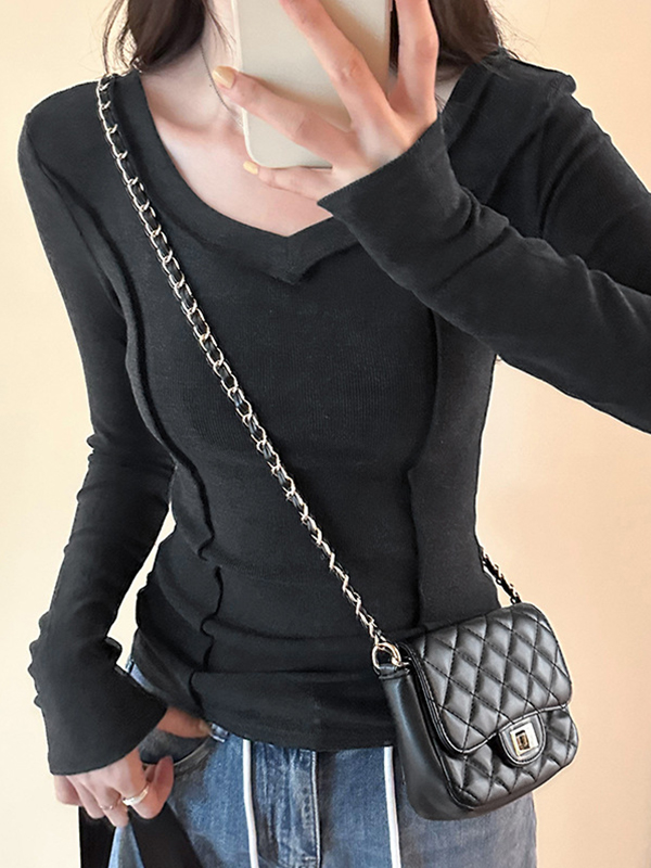 Solid V Neck Seam Detail Slim Long Sleeve Knit