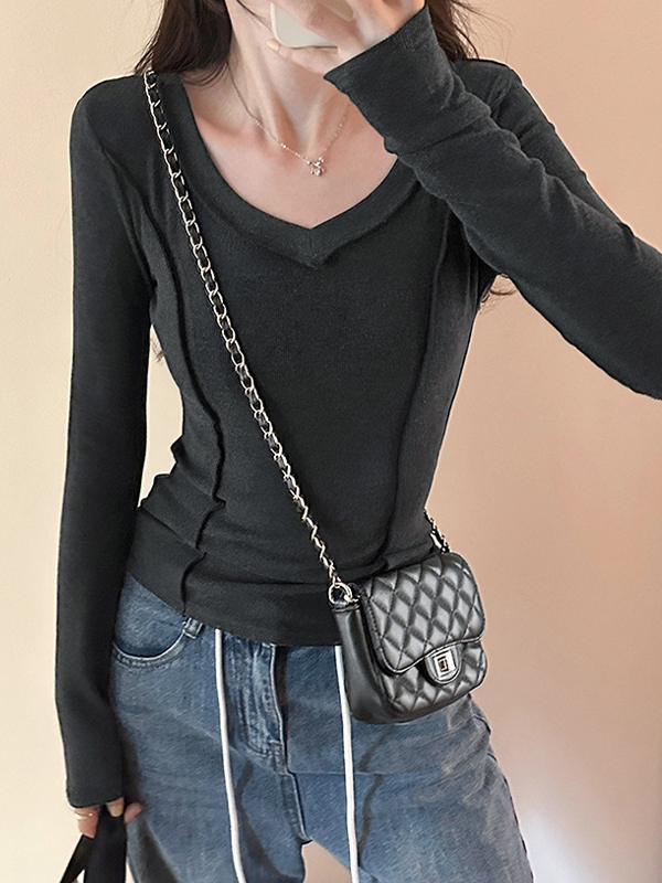/ Solid V Neck Seam Detail Slim Long Sleeve Knit