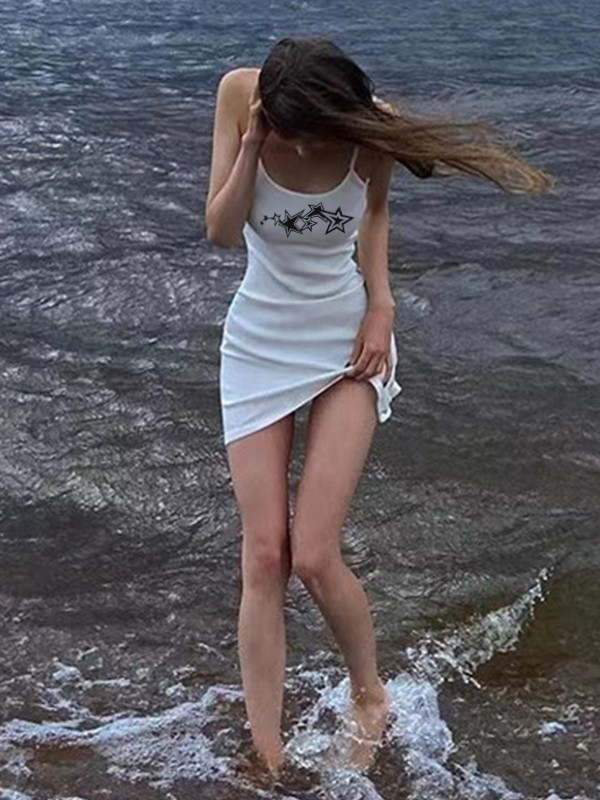 / Star Print Casual White Crewneck Mini Dress