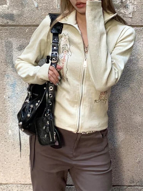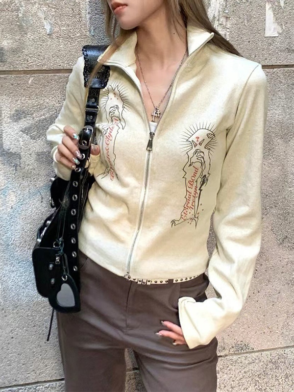 / Vintage Print Lapel Neck Zip Up Long Sleeve Knit