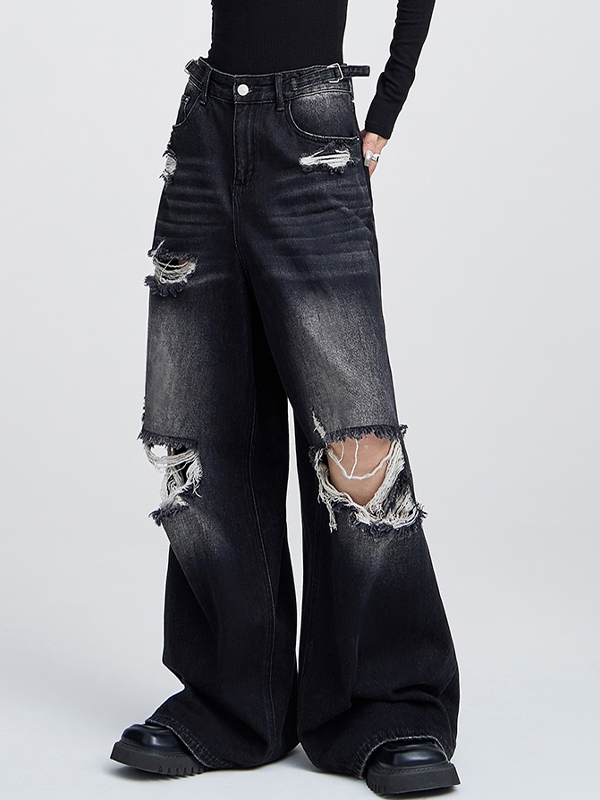 Loose high-waisted versatile straight leg Ripped Jeans